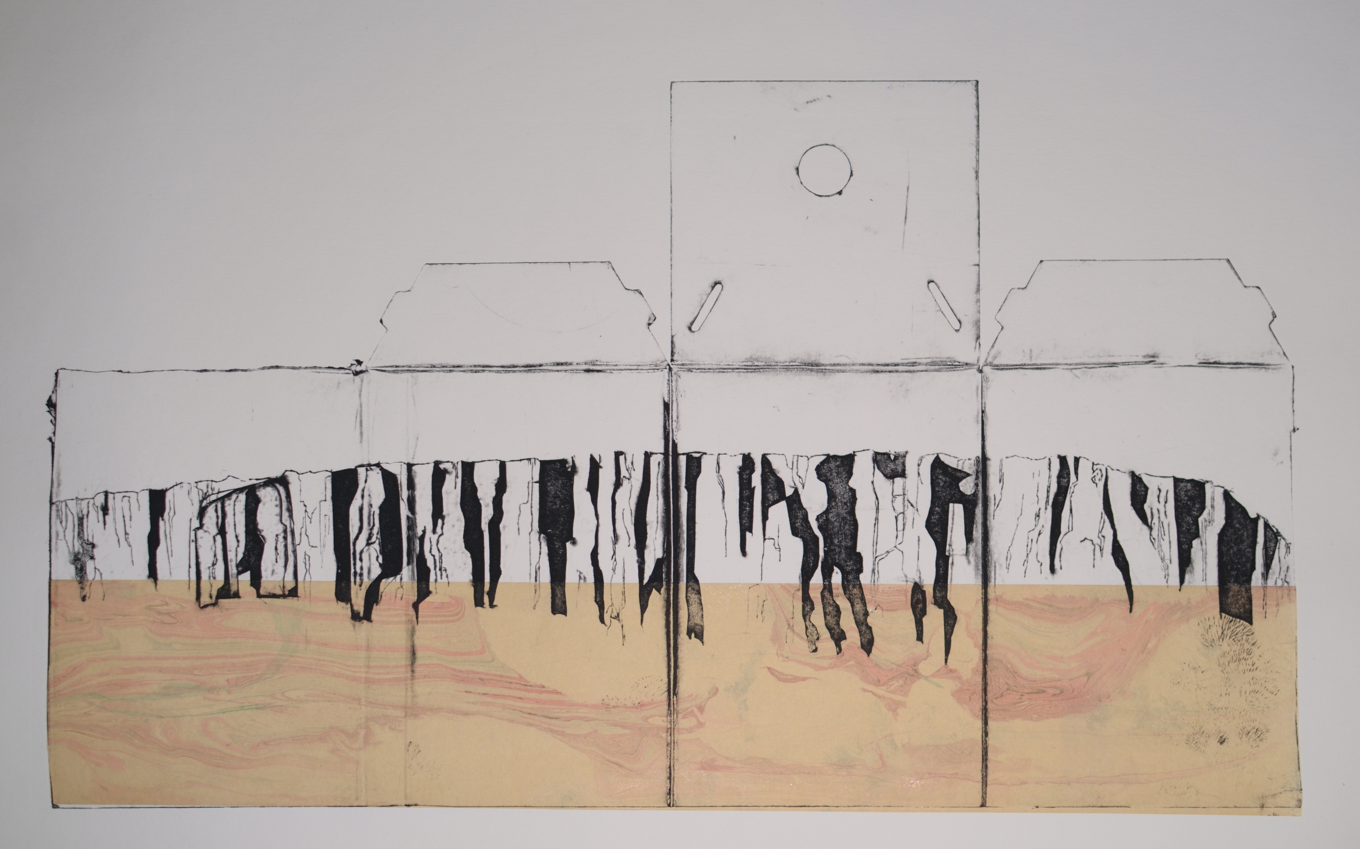 , 2025. Drypoint with suminagashi chine-colle made by the artist on Stonehenge paper.