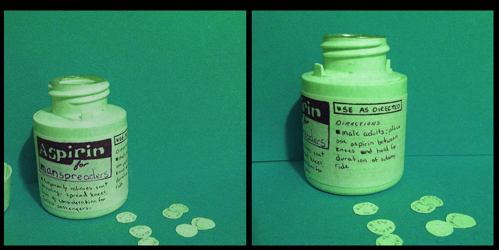 A new aspirin, formulated expressly for manspreaders, “temporarily relieves seat sprawling, spread knees, and lack of consideration for fellow passengers.” When used properly, this low-cost solution shows great potential to reduce crime and mitigate the myriad cultural problems of rampant male entitlement.