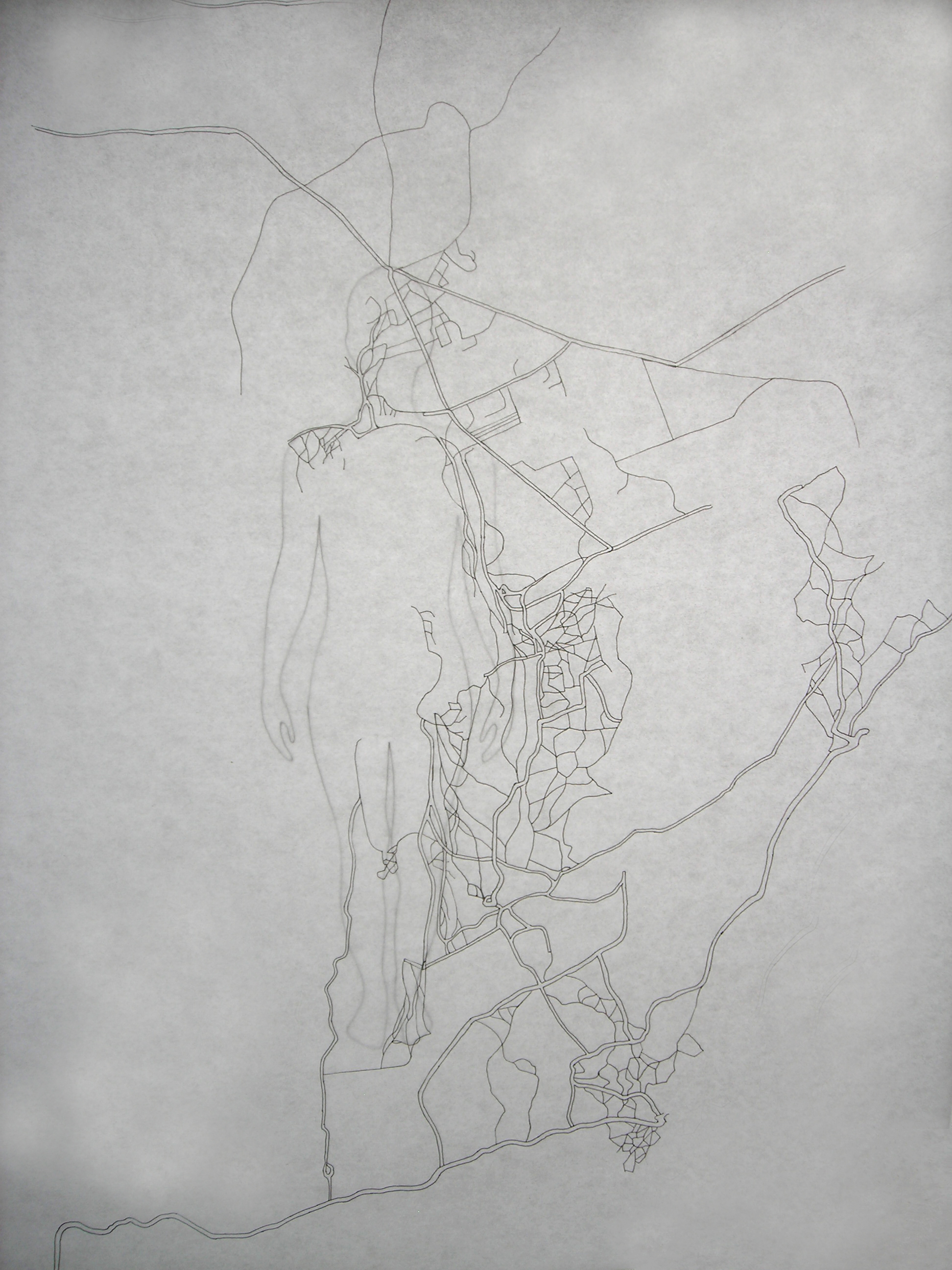 Pen on vellum. 2012. This image explores the homeostatic function of exchange across a barrier by conflating the biological forms of circulation (veins), with constructed forms of circulation (roads). Maps of the roads I have traveled most frequently over my life are overlaid and integrated with the lines of my circulatory system.
